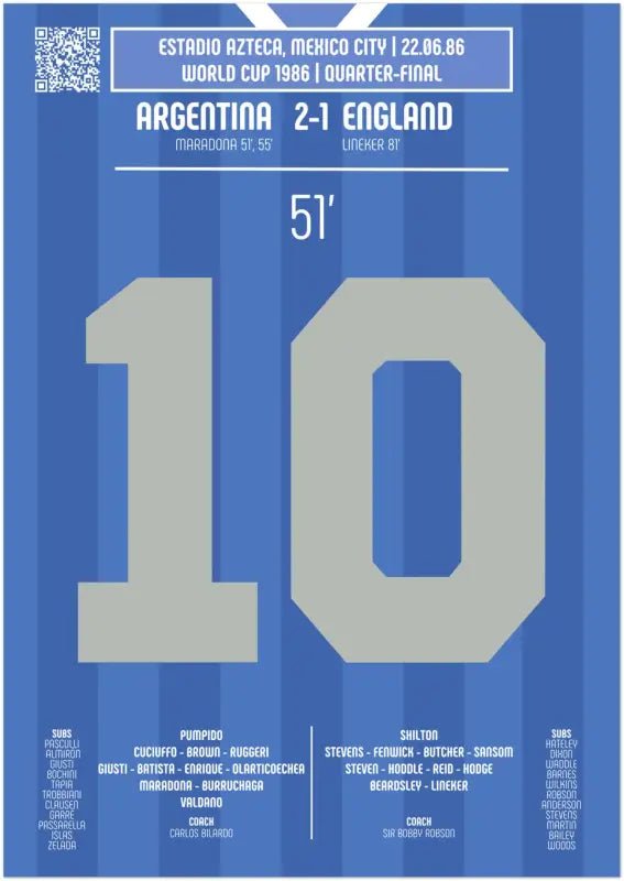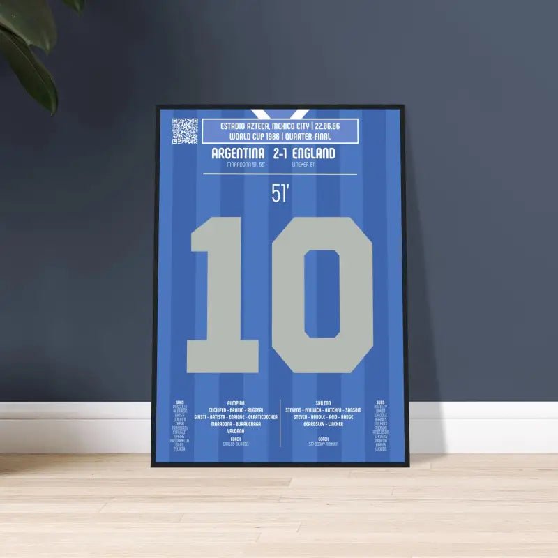 Ce poster est bien plus qu’un simple souvenir : il immortalise un moment de légende, à la fois polémique et emblématique, qui a marqué l’histoire du football. Offrez ou offrez-vous une pièce unique célébrant la "Main de Dieu", le but qui a changé le destin de Maradona et de l’Argentine en Coupe du Monde.