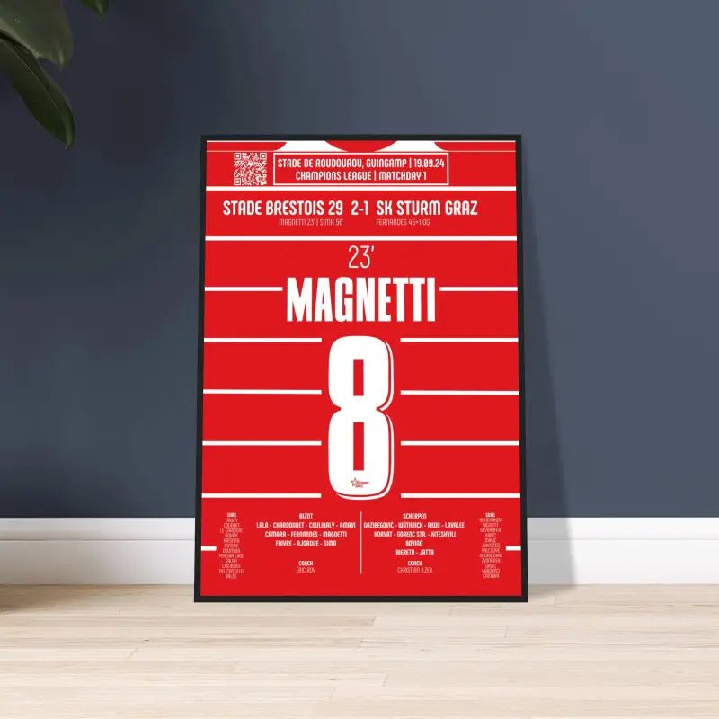 Ce poster rend hommage à Hugo Magnetti, buteur du soir, mais aussi à tout le collectif brestois, symbole d’engagement et de dépassement. Une pièce de collection pour les passionnés de football et les amoureux des débuts qui marquent une légende.