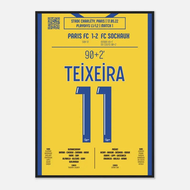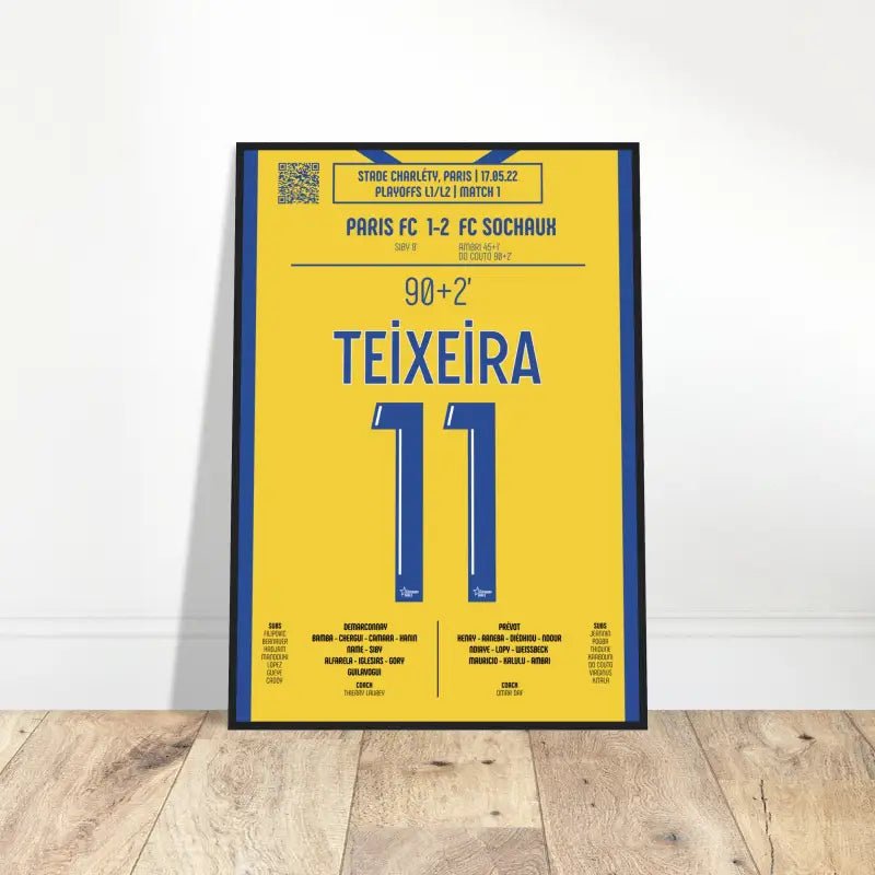 Ce poster est bien plus qu’un simple souvenir : il immortalise un but décisif qui a marqué la campagne de barrages du FC Sochaux. Offrez ou offrez-vous une pièce unique célébrant cet exploit de Maxime Do Couto et la ferveur des supporters sochaliens.