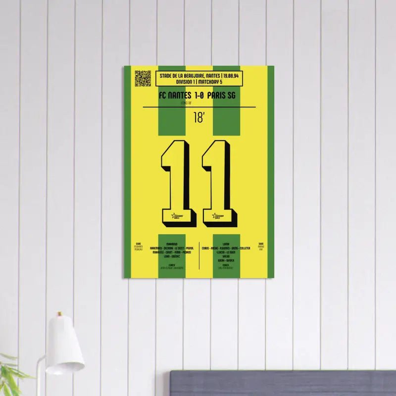 Célébrez ce moment historique avec un poster au design minimaliste et raffiné. Idéal pour les passionnés de football et les supporters nantais, il capture l’excellence du jeu nantais et la beauté de ce but légendaire. Une version encadrée en noir est également disponible pour une présentation encore plus élégante.