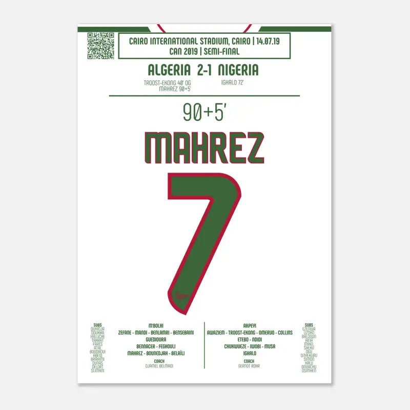 Ce poster est bien plus qu’un simple souvenir : il immortalise un coup franc magique et un moment historique du football africain. Offrez ou offrez-vous une pièce unique célébrant cet exploit de Riyad Mahrez et de l’Algérie.