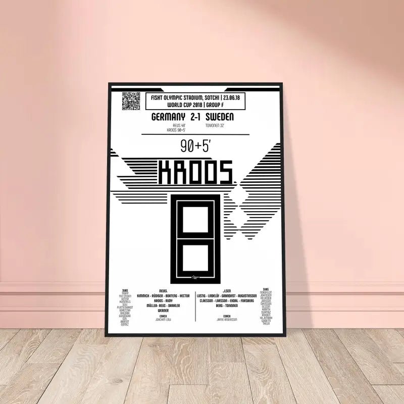 Célébrez ce moment exceptionnel de Toni Kroos avec un poster au design minimaliste et raffiné. Idéal pour les passionnés de football et les supporters de la Mannschaft, il ajoutera une touche d’histoire et de passion à votre intérieur. Une version encadrée en noir est également disponible pour une présentation encore plus élégante.